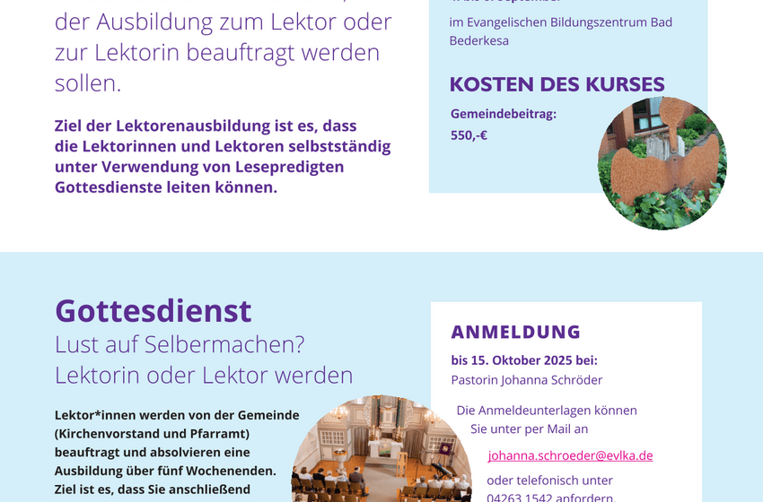 Auch 2026 bietet der Sprengel Stade wieder einen regionalen Lektor*innenkurs an. Ziel ist es, dass Sie anschließend selbstständig Gottesdienste leiten können. Während und nach der Ausbildung ...