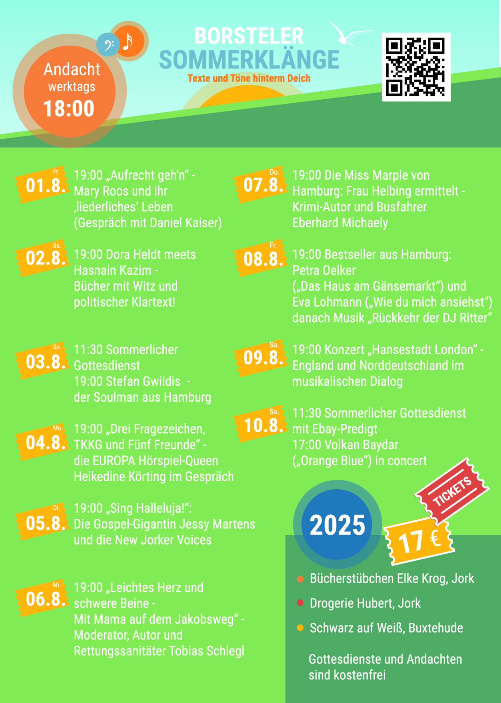 Nach dem großen Erfolg im vergangenen Sommer kommen die beliebten ‚Borsteler Sommerklänge’ in diesem Jahr zurück. Diesmal findet das Benefiz-Kulturfestival vom 1. bis zum 10. August 2025 in der evangelischen Kirche St. Nikolai in Borstel statt.