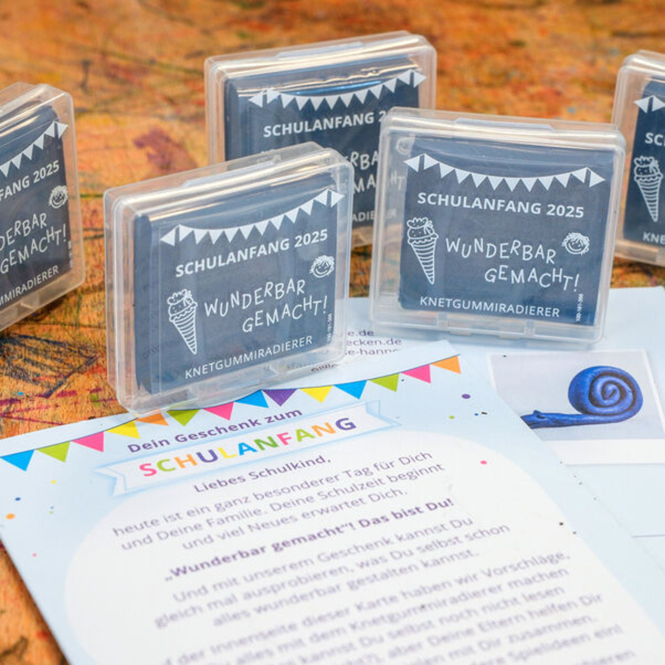 Die Mädchen und Jungen bekommen in ihren Einschulungsgottesdiensten einen Radierer in einer transparenten und wiederverschließbaren Aufbewahrungsbox. Der Clou: Mit der exklusiven Sonderanfertigung eines namhaften Herstellers können die Kinder nicht nur radieren, sondern auch Figuren aller Art kneten.