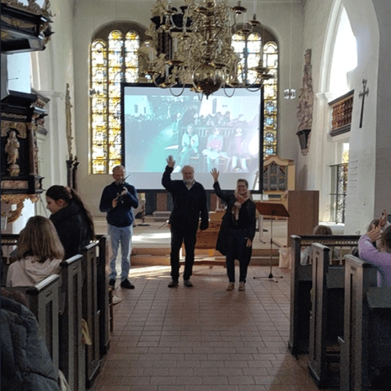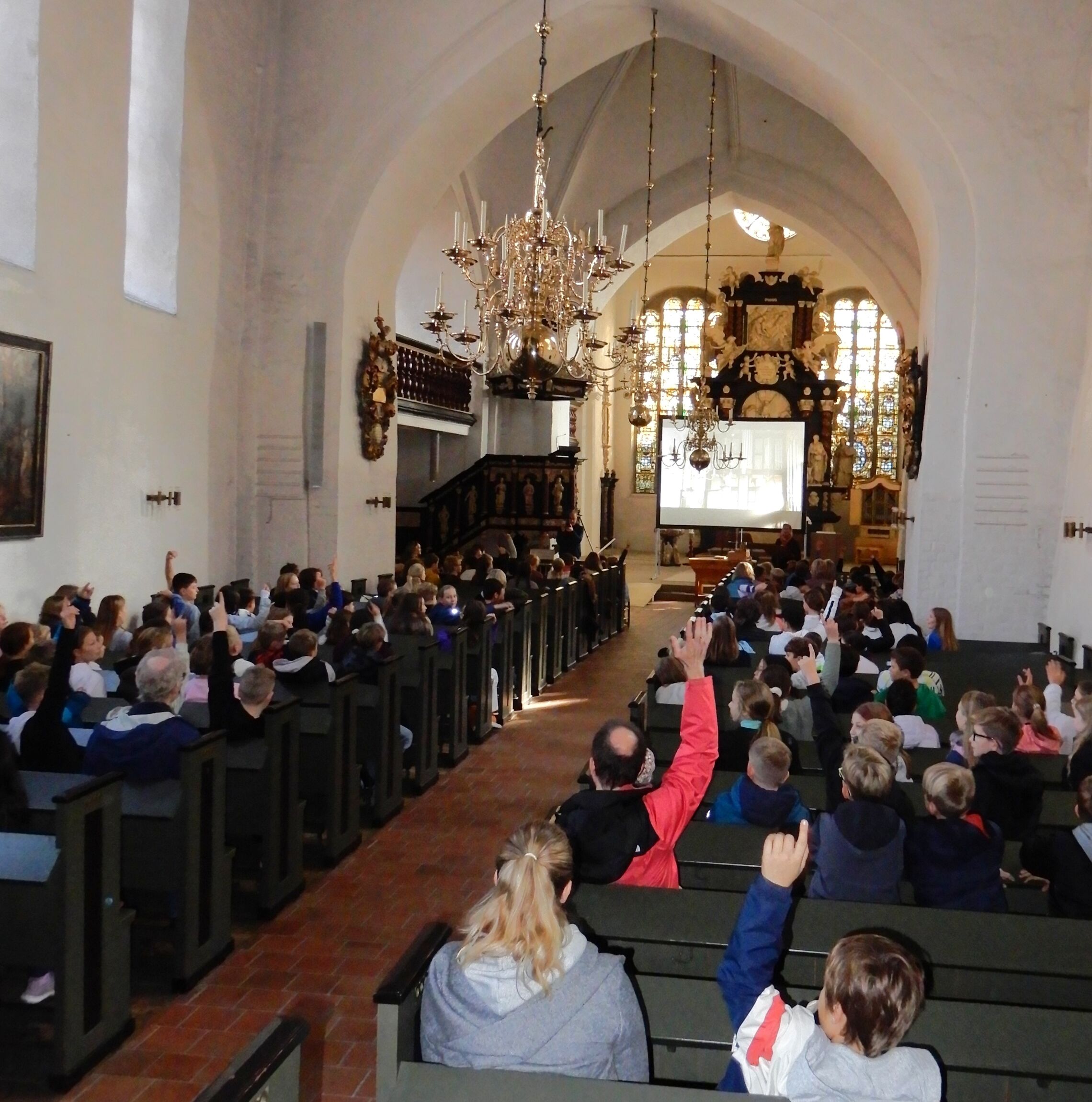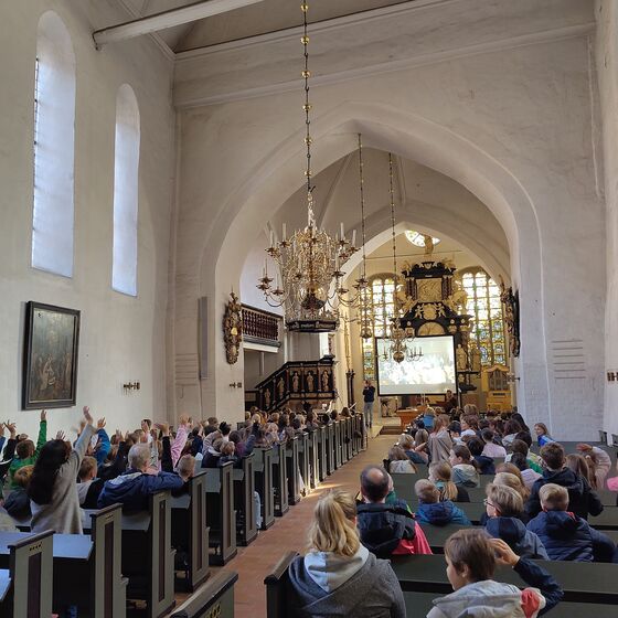 Großes Staunen ging durch die Kirche, als die Kinder hörten, dass die Orgel rund 2.500 Pfeifen enthält und dass jede von ihnen nur durch einen gezielten Luftstrom zum Klingen gebracht wird. Wie viel Muskelkraft das früher bedeutete, wurde schnell klar, als zwei Lehrkräfte sich auf die Empore wagten und demonstrierten, wie damals Luft mit großen Blasebälgen in die Orgel gepumpt wurde. Zum Abschluss hieß es: Mitmachen statt nur zuhören. Bei der „Lebendigen Orgel“ bekam aus jeder Klasse ein Kind eine Pfeife, und gemeinsam ließen sie Lieder wie Bruder Jakob erklingen. So wurden sie selbst Teil des großen Instruments.